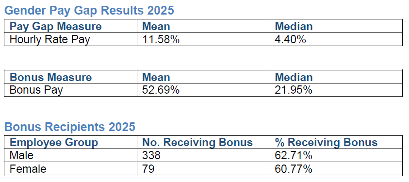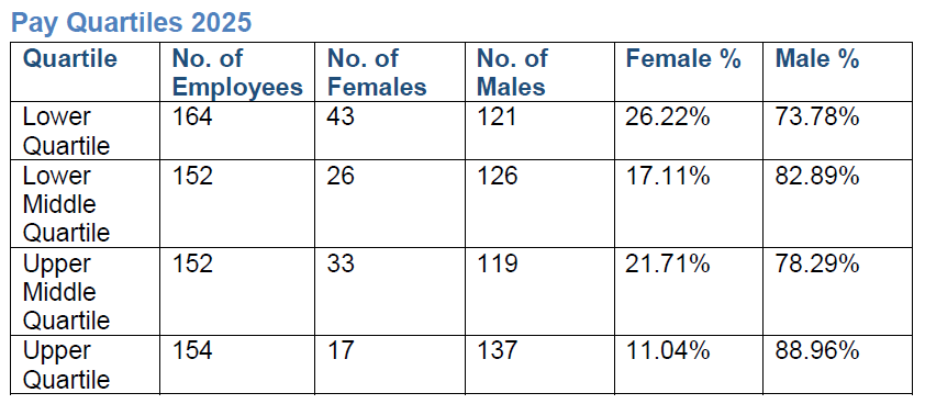 The median hourly pay gap for 2025 is 4.4%. The mean hourly pay gap stands at 11.6%. This is influenced by the distribution of male and female employees across higher-level roles. Female representation remains lower across senior positions and sales roles, contributing to the overall pay gap. The proportion of female applicants continues to be lower than hoped for, which influences representation within higher-paid quartiles.